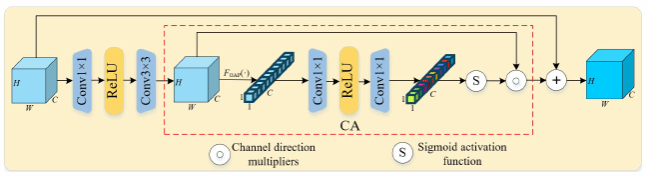 如图3所示,低参数的残差通道注意力块在传统的压缩-激励通道注意力基础上增加了一个非对称的低参数卷积网络,首先以1*1卷积核聚合通道信息,然后经过一个ReLU激活层,再以3*3的卷积网络聚合空间信息,这种非对称的低参数结构有效增强了张量通道上与空间上信息的交互,在此基础上结合压缩-激励通道注意力网络进一步去除通道冗余信息。