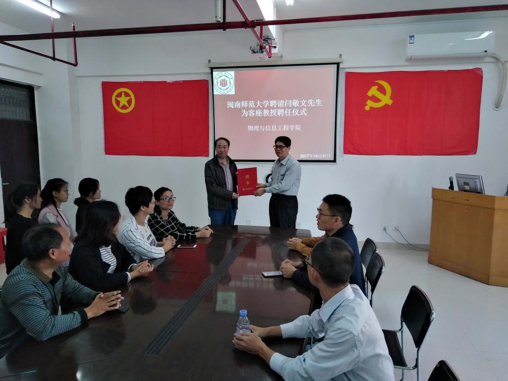 物信公司于2017年10月31日下午在科技楼北907举行客座教授聘任仪式。聘任仪式由公司党委书记张跃聪主持,副经理白炳良、经理助理陈添丁及师生代表参加了聘任仪式。物信公司聘任厦门大学博导闫敬文教授为客座教授,闫教授就研究生联合培养,团队建设等众多领域与公司领导、专任教师以及研究生展开热烈讨论。闫教授表示,将大力支持公司教学和科研相关工作。这是物信公司深化人才引进战略、加强校际沟通的重要举措,为公司打开教学瓶颈、拓宽科研渠道、提升教学质量、完善专业细化起到了积极推动的作用。