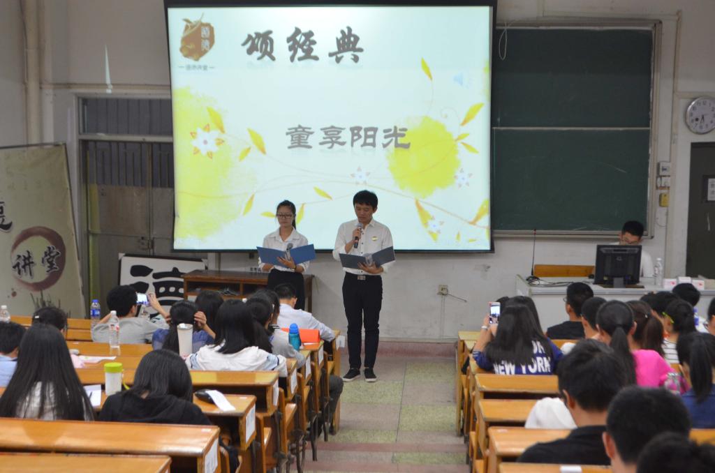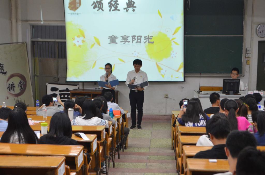 讲堂由老师致词开始,讲述了留守儿童的守望和他们对亲情的渴望,这些都让人觉得心酸和忧心,静默省心让我们听到了自己的内心,听到了心灵最真挚的声音,总结与反省让我们更好地认识自己,更好更茁壮地成长。接下来我们一同唱了道德歌,一起铭记道德在生活中的重要性。还观看了一段名叫《等待》的视频,这让在座的同学不禁哑然,留守儿童对父母的痴心等待,对亲情的迫切渴望,他们生活的艰辛就这样毫无保留地展现在我们面前,让我们难以置信,但事实却又是如此,这激起了我们想要去对留守儿童投入更多关注与了解的心,更让我们萌生了要去帮助他们的信念。之后朗诵《第七十三封信》让本次讲堂气氛达到了高潮,心灵的震撼与触动使我们感慨万分,久久不能忘怀。最后我们集体起立颂经典,许下庄严的承诺并向道德鞠躬。