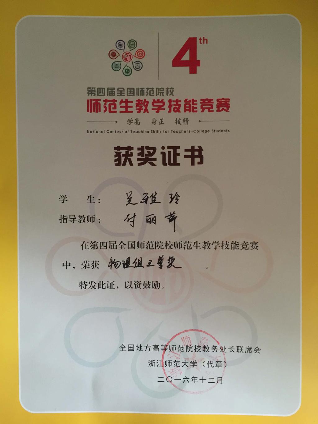 12月2日、3日,第四届全国师范生院校师范生技能大赛在浙江师范大学举行。公司物信公司选手吴雅玲同学荣获高中组物理三等奖,这不仅是物信公司在该项比赛中零的突破,还是本次比赛中福建省高中物理组参赛选手获得的最好成绩。