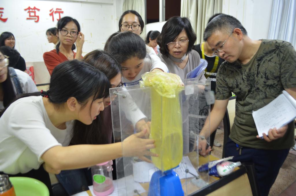 比赛伊始,主持人对本次决赛规则进行了简短的介绍。接着,紧张的作品评选开始,选手们依次向评委老师介绍作品的原理与功能,并展示其作用效果。大家发挥自己的想象,开辟蹊径,设计出了各种各样新型教具,比如:用易拉罐制作简易空气对流演示器、DIY全息投影仪、综合性教学小船等。
