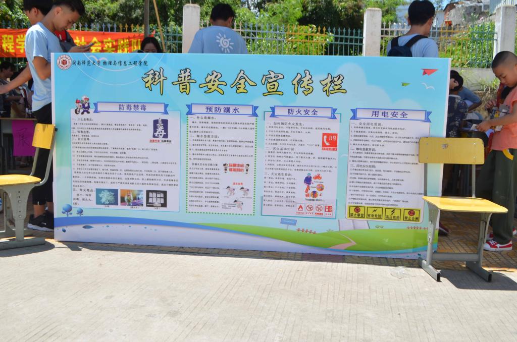 实践队主要通过展示宣传栏、分发宣传单、现场宣讲等方式向当地居民普及禁毒、安全知识。通过宣传栏介绍毒品类型、国家禁毒相关法律、讲述毒品的各种危害。宣传栏的展示,吸引了大人小孩的驻足观看。还有一路小分队在集市积极派发宣传单,通过阅读宣传单,居民能够详细的了解到毒品的分类、危害、以及如何有效抵制毒品等内容。尤其是实践队员们绘声绘色的讲解更使当地居民们深刻地感受到毒品对人类的危害。除了对禁毒内容的宣传,实践队还给居民开展了防火、防溺水、安全用电等方面的知识宣传,防火、防溺水,是常见且不可忽视的问题,值得注意和防范。作为经常与电打交道的物信人,结合自己的专业特色、自己的所学,为居民们带去安全用电知识,更体现我们学以致用、服务社会的宗旨。