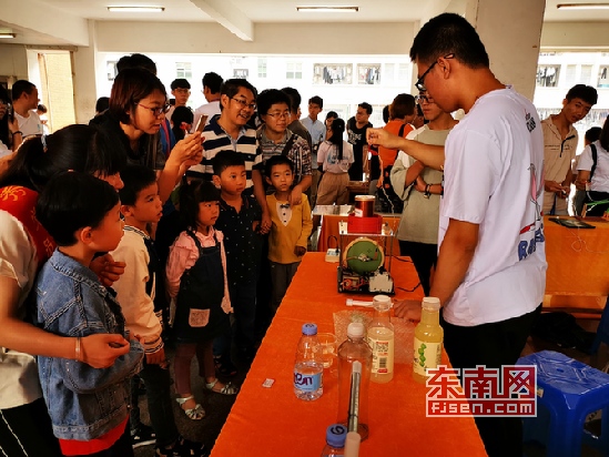 尖端放电实验演示器吸引了众多孩子、家长围观