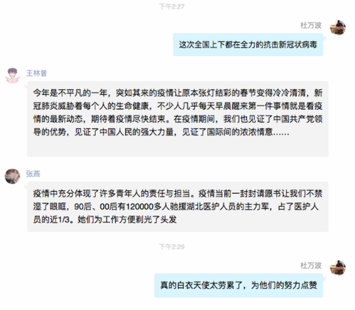 在这场特殊战役中,公司倡导员工根据自身情况和学业要求合理规划实践,鼓励搭建“空中课堂”,创建学习交流群进行课堂答疑、学习打卡、开展线上健身锻炼打卡等活动。