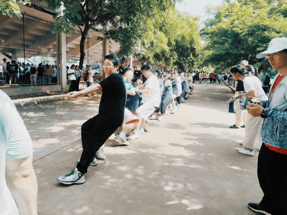 参赛的同学们个个斗志昂扬,为了集体的荣誉拼尽全力,当比赛的哨声一响起,队员们口中一起高呼着“一二,一二”,双手紧握长绳,憋足了劲拼命往后拉
