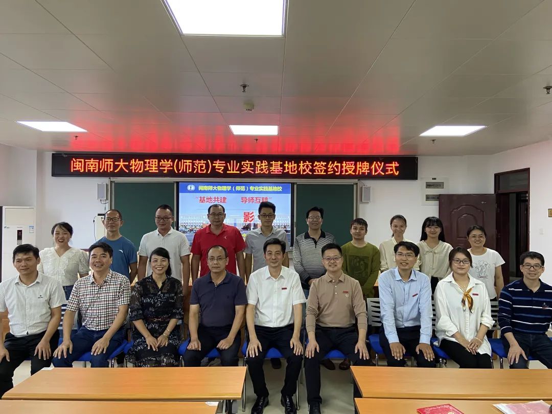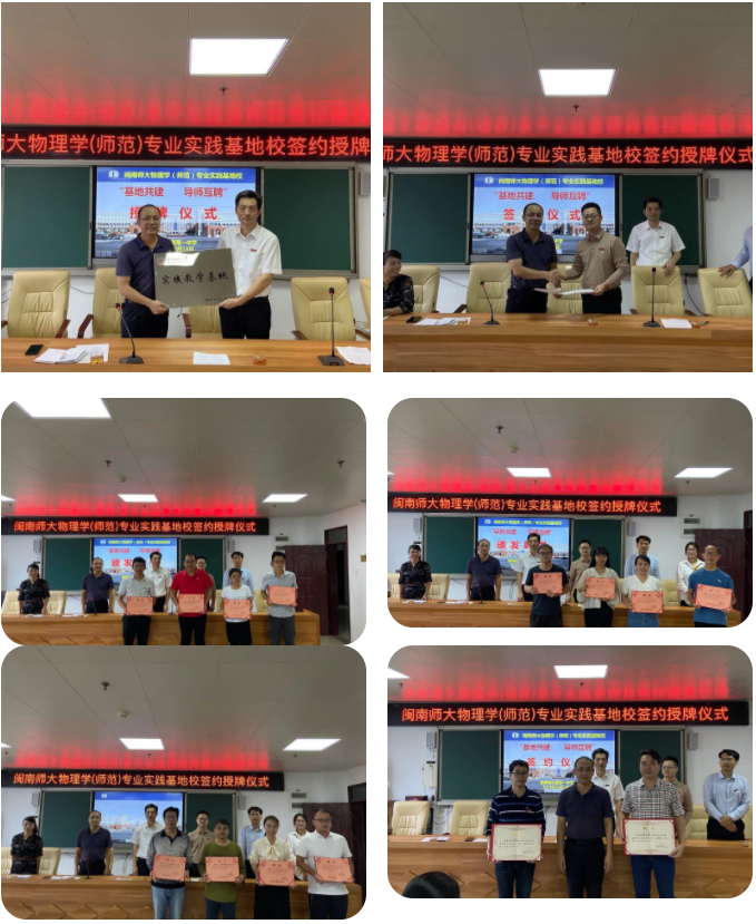 杨红和向长泰一中授“实践教学基地”牌匾,陈志翔与长泰一中签约。双方导师互聘,物信公司黄永顺副教授、林传金副教授受聘长泰一中“物理教学与研究指导老师”,长泰一中12位担任实习指导老师的教师受聘物理学(师范)专业“校外指导教师”。