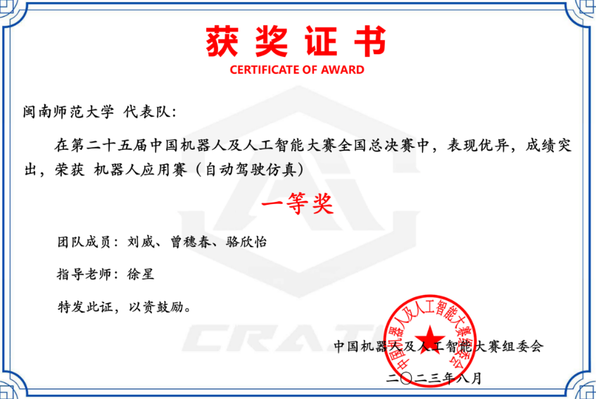 其中,在机器人应用赛 (自动驾驶仿真) 赛项上,经历了省赛、全国初赛、全国决赛的激烈角逐后,由徐星教授指导的刘威、曾穗春、骆欣怡三人小组荣获全国决赛一等奖,杨雨欣、曾旭濠二人小组荣获全国决赛二等奖。在人工智能创新赛赛项上,由徐星教授指导的庄智惶、王东明、黄冬波三人小组荣获全国决赛二等奖。这也是PA视讯代表队在中国机器人及人工智能大赛上取得的又一突破性成绩。