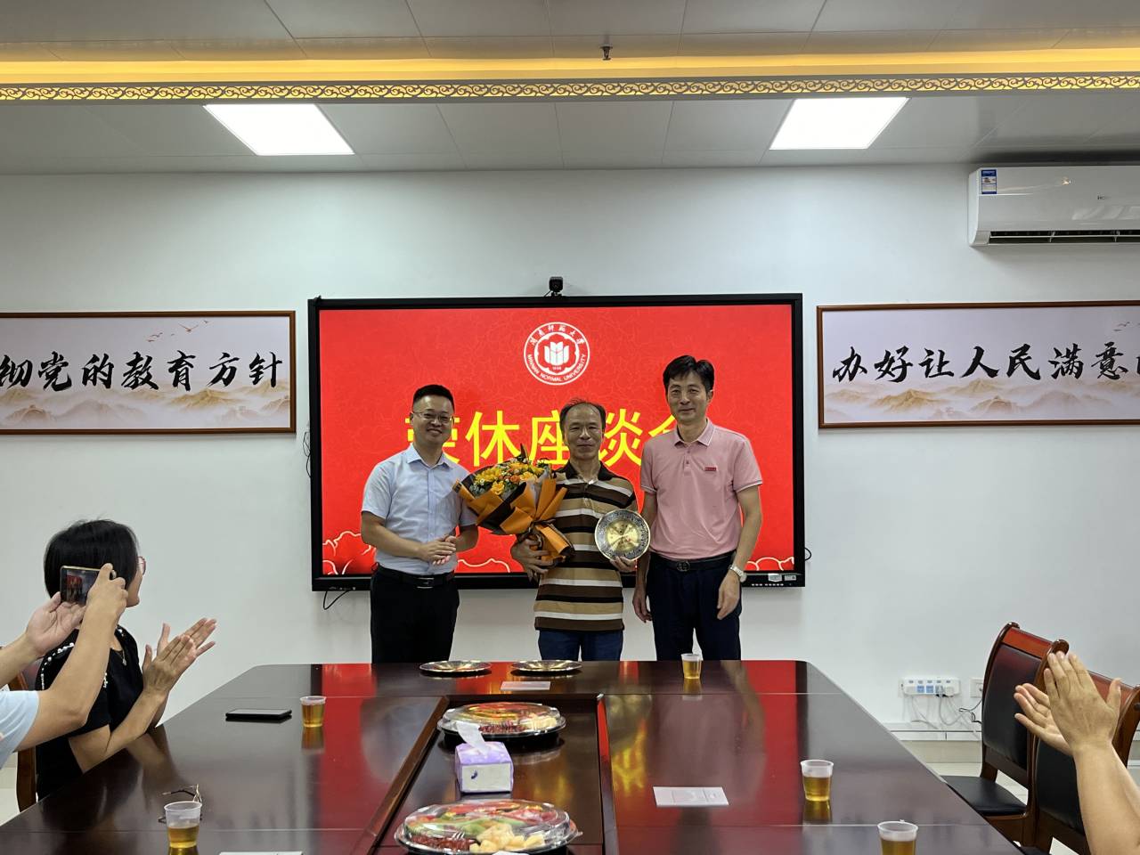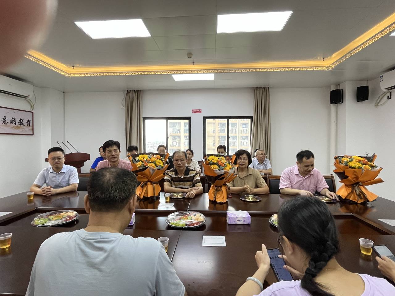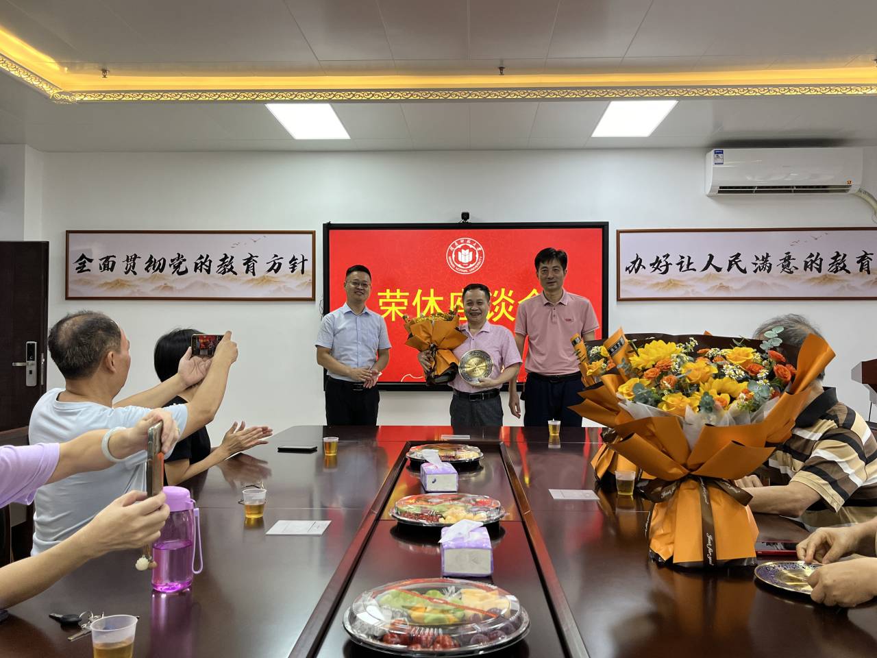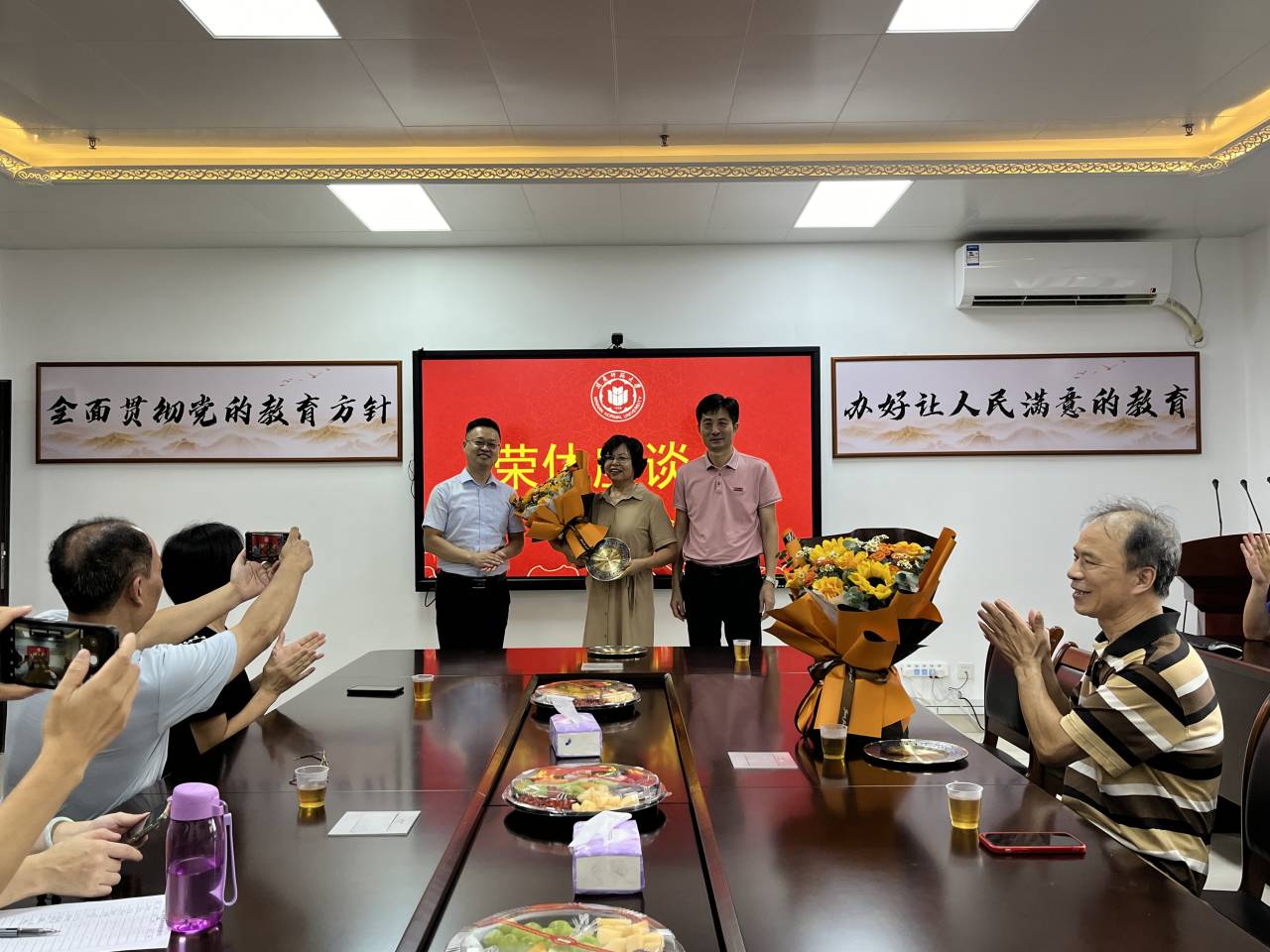 座谈会上,杨红和书记和陈志翔经理向荣休教师付丽萍、郭海燕、洪清辉三位老教师赠送了纪念品和鲜花,祝贺他们光荣退休。荣休教师深情回顾了在公司的奋斗历程,分享了自己在立德树人、教书育人的深切感悟,表达了对公司的不舍和未来前进的期望。教师代表纷纷发言,表达了对三位退休教师的敬重、感激和不舍,并送上了诚挚的祝福。