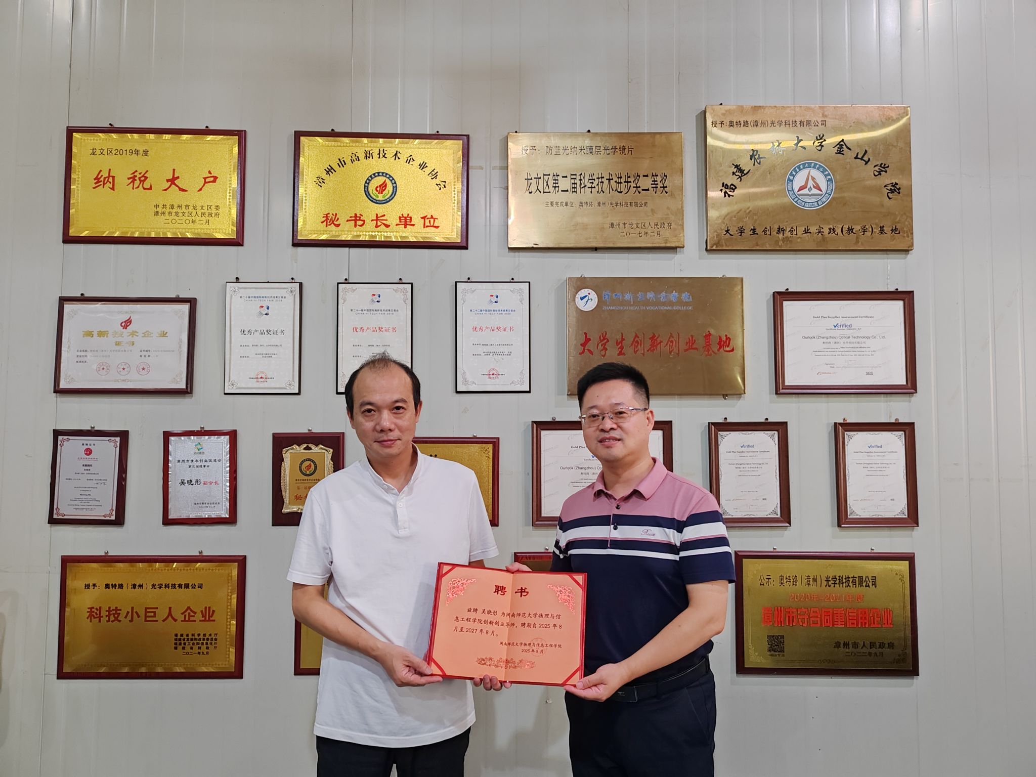 在奥特路(漳州)光学科技有限公司,总经理吴晓彤详细介绍了公司发展、产品特色、产品研发及项目情况。双方就项目合作、光学应用等方面展开深度探讨,为后续合作奠定了良好基础。期间,公司聘请吴晓彤为创新创业导师,进一步加强校企在人才培养等领域的联动,助力提升员工就业竞争力。