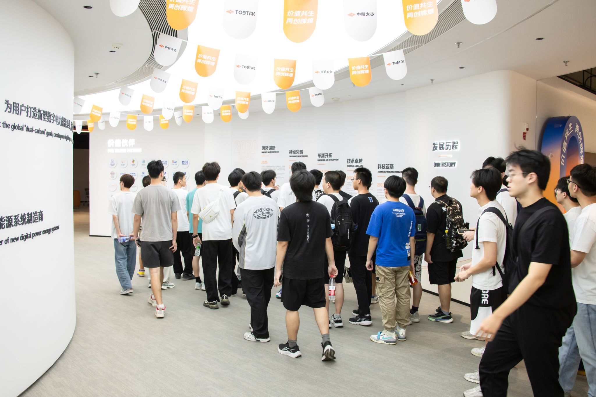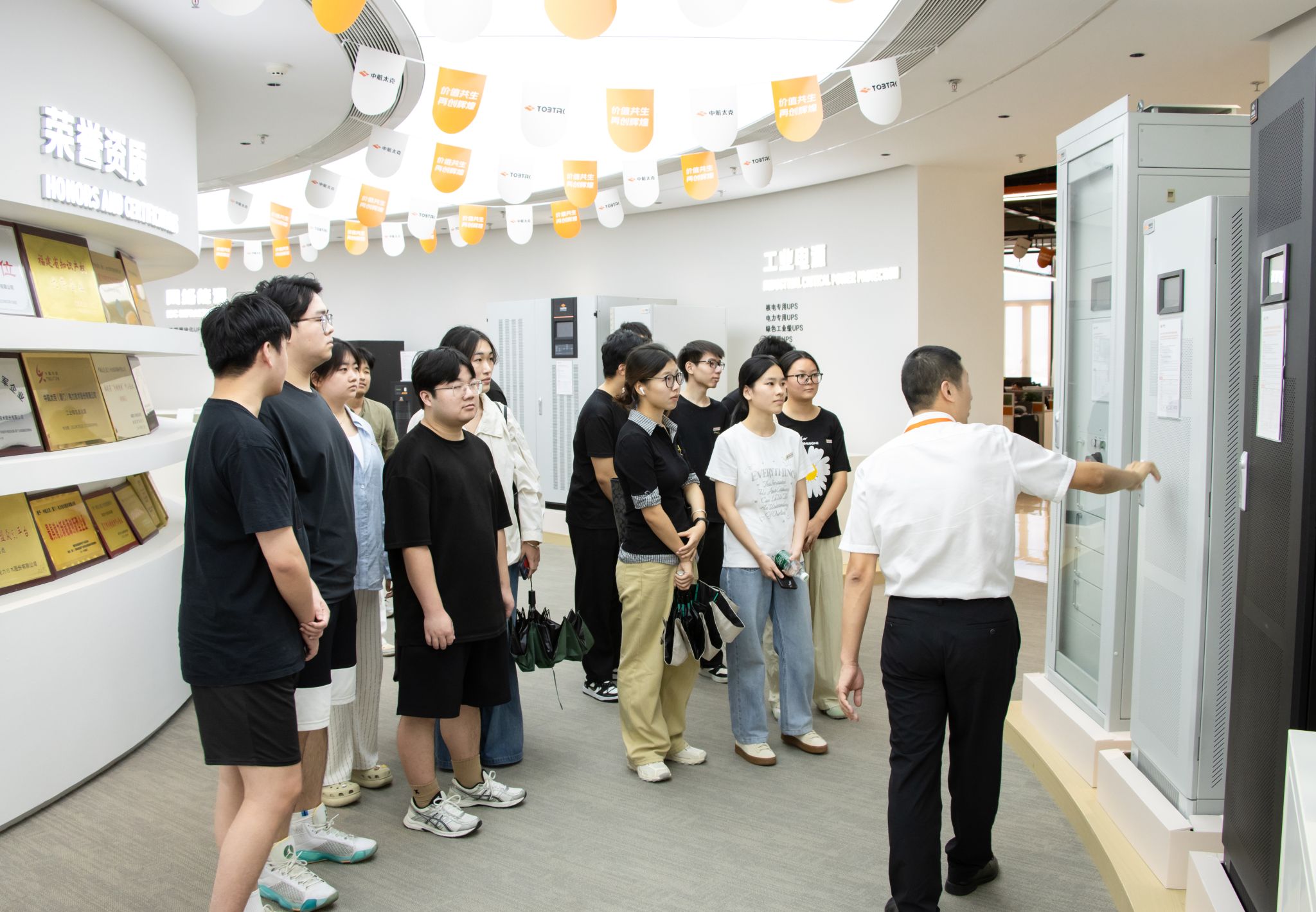 下午2时,师生一行抵达中航太克园区,受到企业代表热情接待。在简短欢迎仪式后,公司工作人员引导师生依次参观八楼办公区域与九楼产品展厅。从研发环境到成果展示,从企业文化到技术应用,参访过程全面展现了中航太克在电力电子技术领域的专业实力与创新氛围,为员工提供了一场沉浸式的行业认知体验。