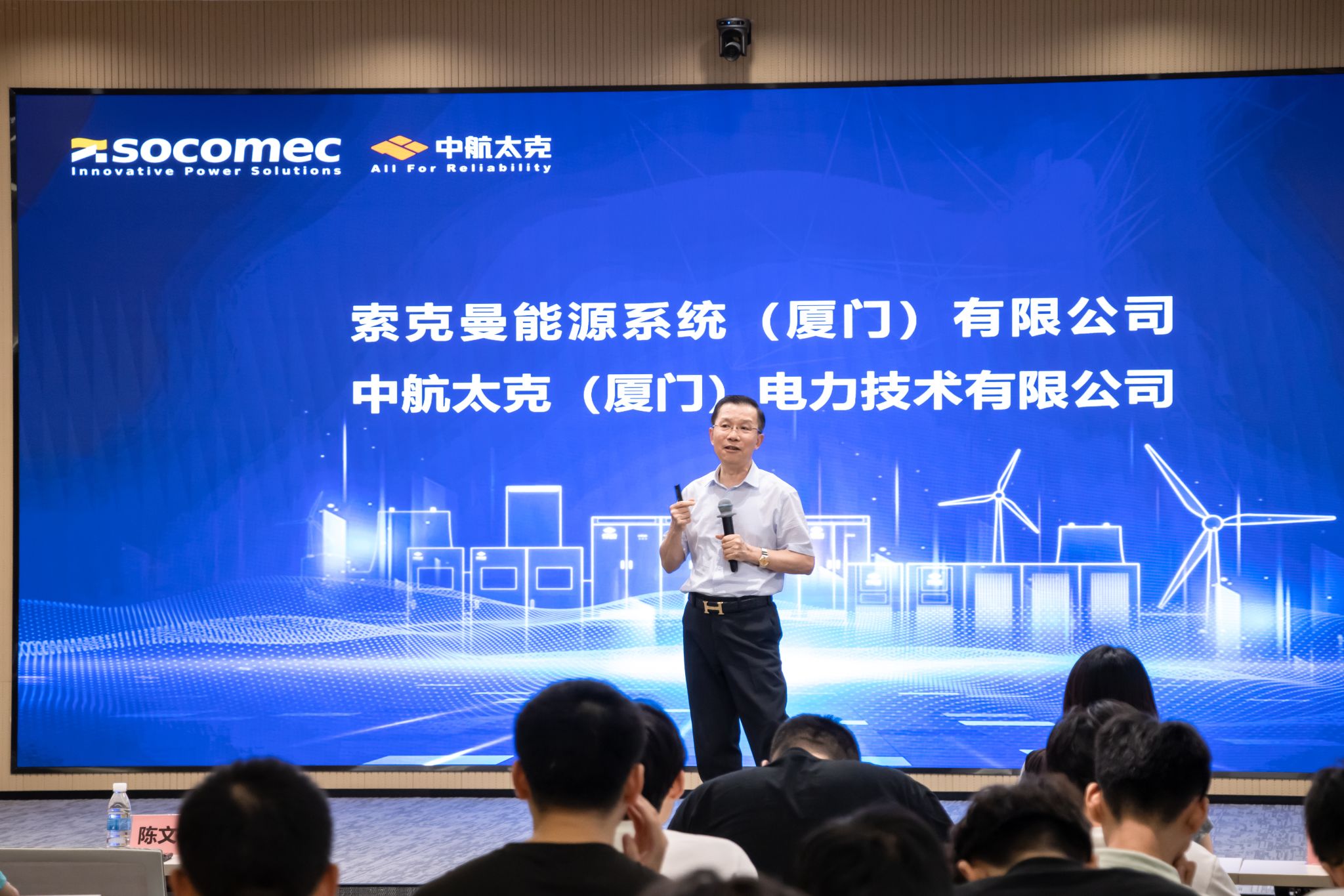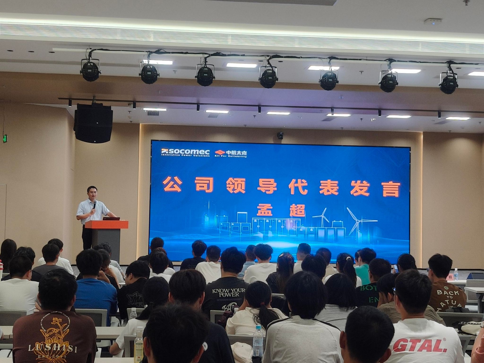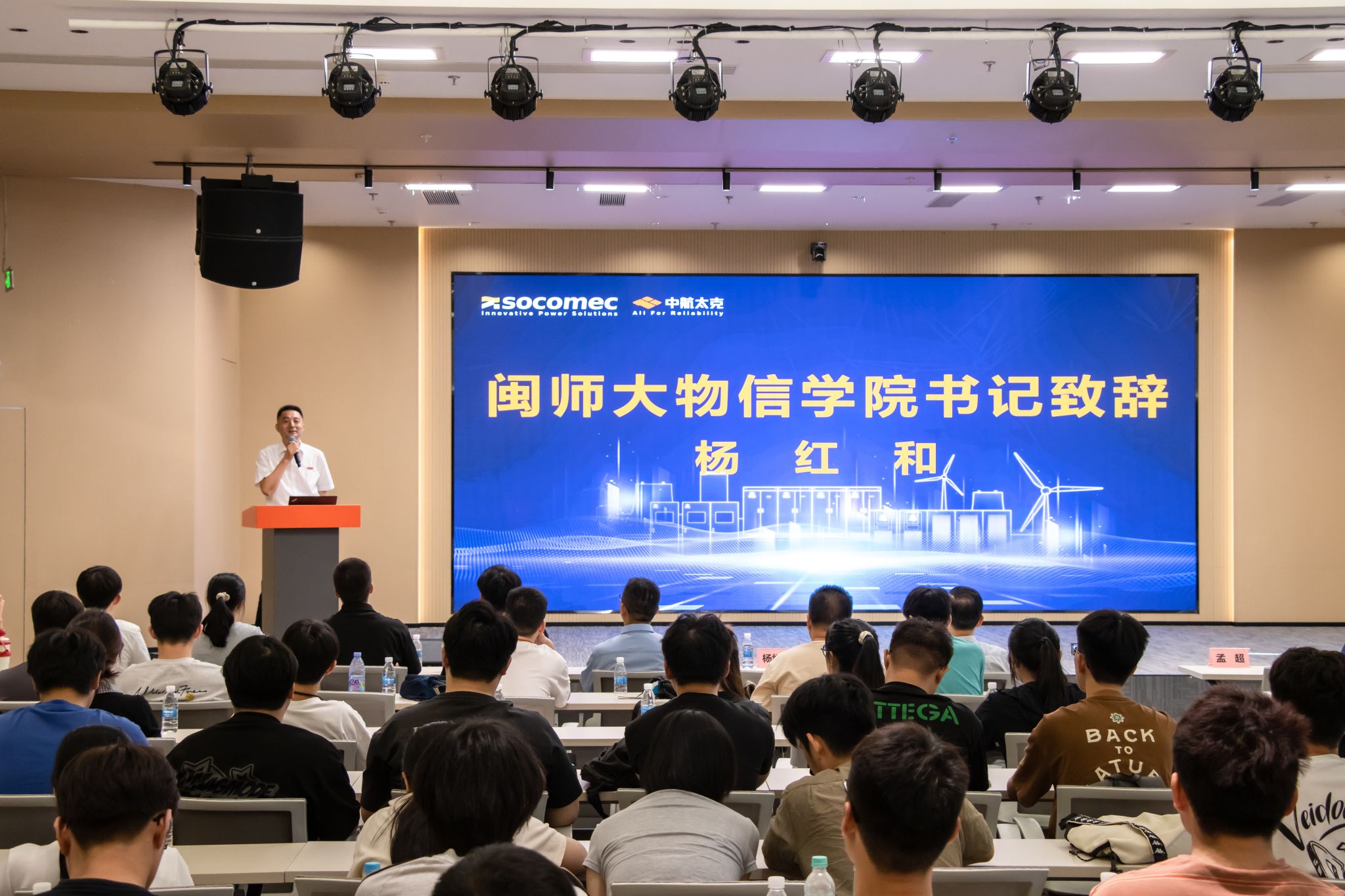 中航太克公司董事长陈文全回顾了企业创业历程,感谢物信公司培养的毕业生助力公司发展壮大,并分享了公司在电力电子领域的技术突破与国际合作。他强调能源行业正处于战略机遇期,鼓励同学们热爱专业、持续学习、胸怀大局、脚踏实地,将个人成长融入国家发展。中航太克将持续深化校企合作,欢迎更多优秀学子加入,共同助力科技强国建设。