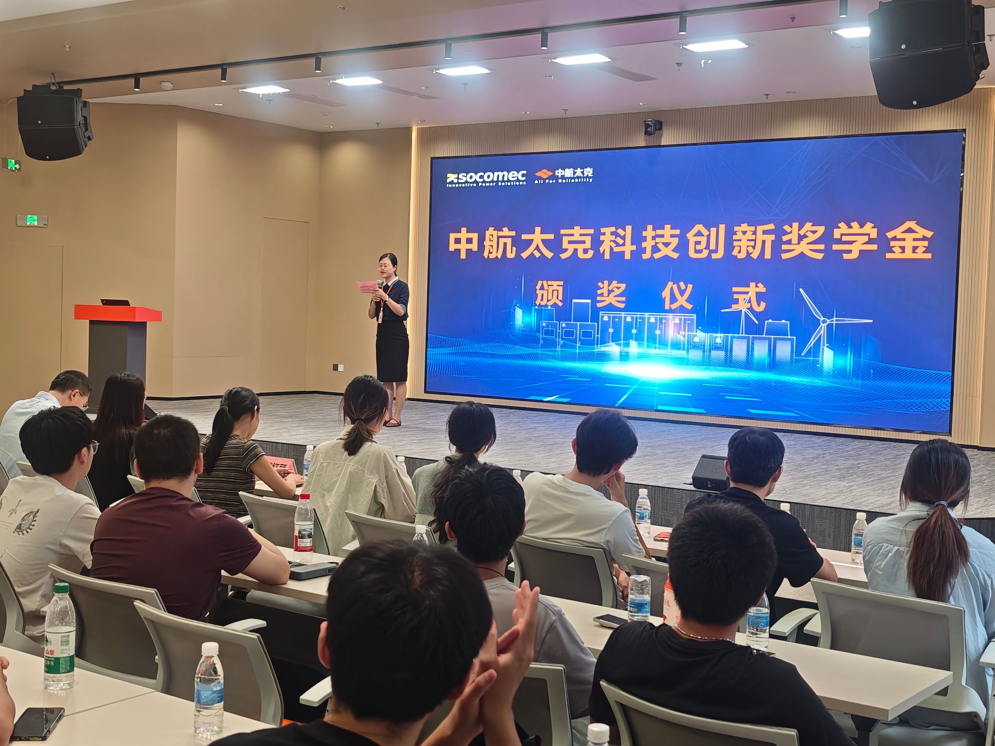 参观结束后,双方于九楼会议室举行了中航太克科技创新奖学金颁奖仪式。中航太克公司副总经理孟超在致辞中感谢物信公司培养的优秀毕业生对公司发展的重要贡献,并指出能源电力行业是国家工业基石,在新能源技术推动下迎来重大机遇,电力电子领域前景广阔、潜力巨大,将成为未来能源系统的核心。公司设立该奖学金,既是对往届毕业生的认可,也期待更多学子加入,共同投身电力电子技术事业。