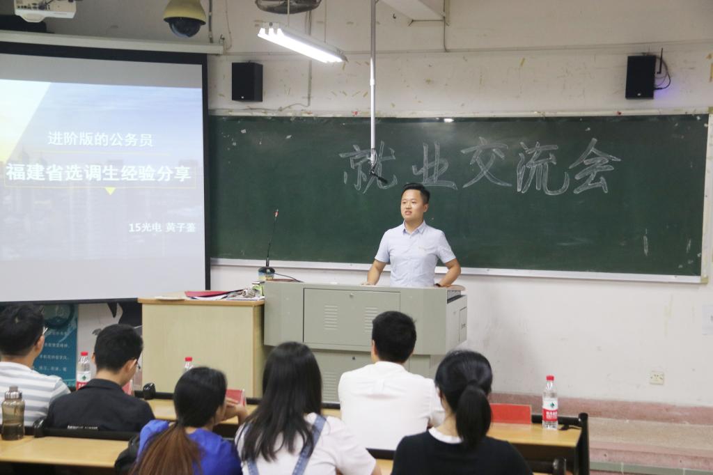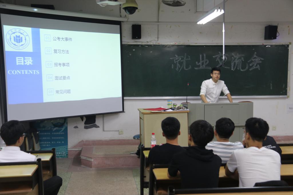 选调生代表黄子鉴学长,针对什么是选调生、选调生的就业方向等做了详细的讲解。他从考试内容,笔试备考,面试备考三个方面进行分析,以自己的切身经历向同学们传授了考选调生的宝贵经验。黄子鉴同学还把自己的备考资料整理成电子版,与大家一起分享,给大家增添了备考信心与力量。